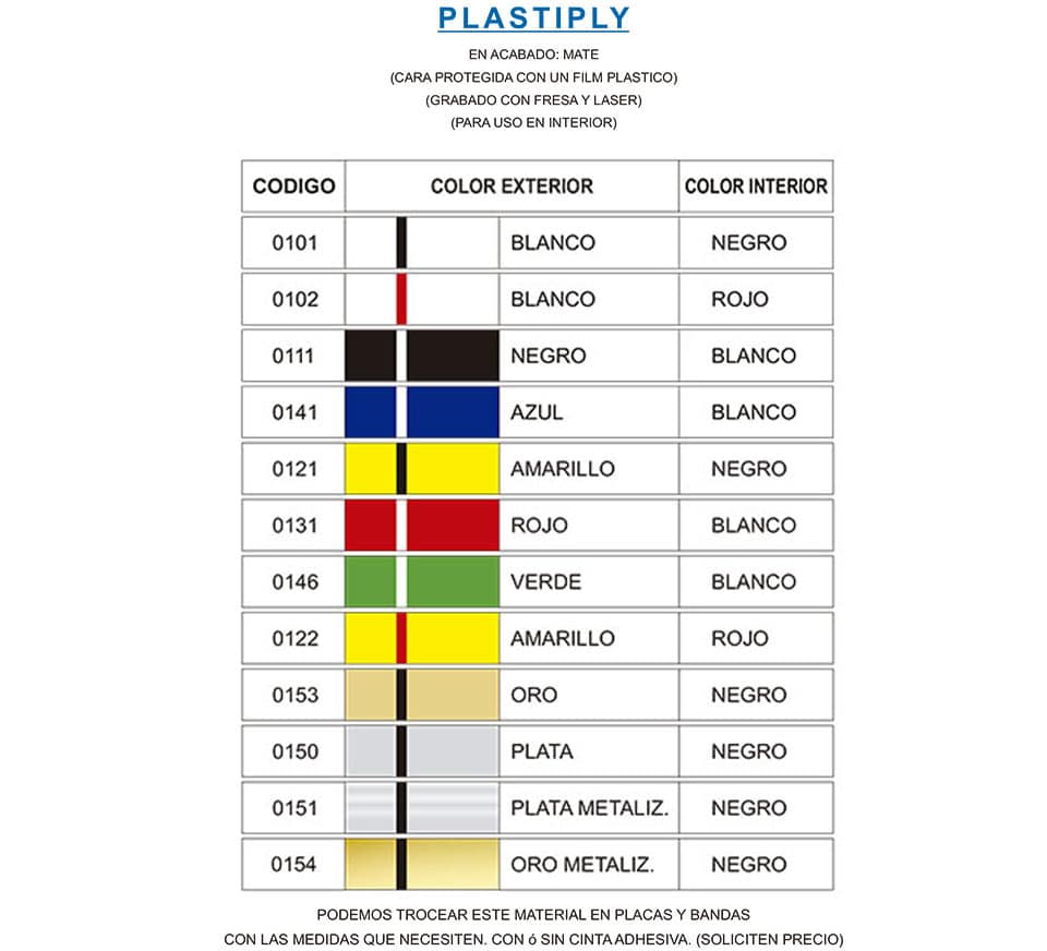El PLASTIPLY es un material plástico bicapa ABS flexible con una cara buena para grabar, con el acabado mate y protegida con un film plástico. Es muy apreciado por los profesionales para el grabado de placas y la serigrafía. Para uso interior.